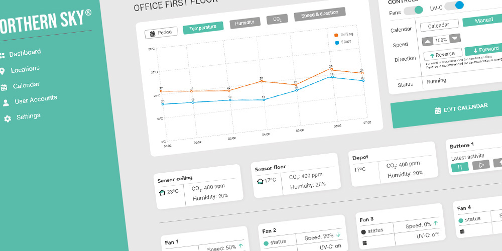 Om het simpel te zeggen. Een betere luchtverdeling resulteert in een beter binnenklimaat. De combinatie van plafondventilatoren en het Northern Sky platform om faciliteitsgegevens te controleren en te presenteren, maakt het mogelijk om een hele reeks binnenklimaatproblemen op te lossen. Alles van CO2-zware en stilstaande lucht tot onbenutte warmte, vochtigheidsproblemen en onaangename geuren.