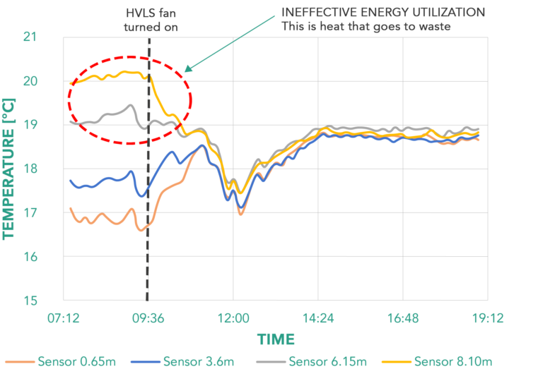 Het figuur aan de linkerkant toont een voorbeeld van temperatuuregalisatie, ook wel destratificatie genoemd, in een grote ruimte. Sensoren op verschillende hoogtes in de ruimte maten de temperatuur vóór en na het inschakelen van een HVLS-ventilator. Zoals de grafiek laat zien, wordt de temperatuur gelijkmatig verdeeld over de vier meetpunten en wordt een temperatuur van ongeveer 19°C verkregen in de hele ruimte. Het interessante hierbij is dat de temperatuur op vloerniveau met 2°C stijgt zonder extra warmte toe te voegen.